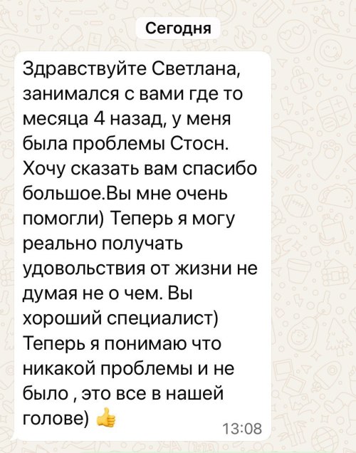 Применяя необычные приемы с мастерством профессионала помогла убрать и нейтрализовать ту боль, злость и обиду , что засела в теле и была камнем преткновения на пути к достижению целей и получения желаемых результатов. Мы вышли на ресурс и заякорили это состояние. Вышли на ощущения: целостности, уверенности и ценности себя.