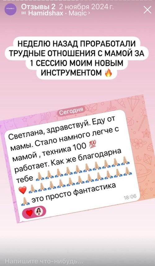 Это - самый выгодный формат работы, так как вы получите 3 сессии-проработки со мной по ТНП, далее я научу вас применять технику для себя и прорабатывать свои любые запросы, а также помогать близким, и даже работать с клиентами. Итоговая сессия - супервизия вашей работы с реальным запросом "клиента".