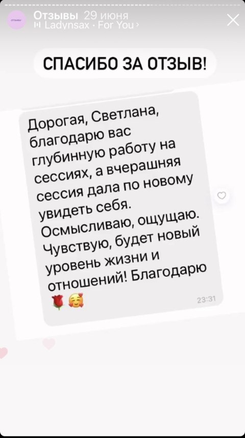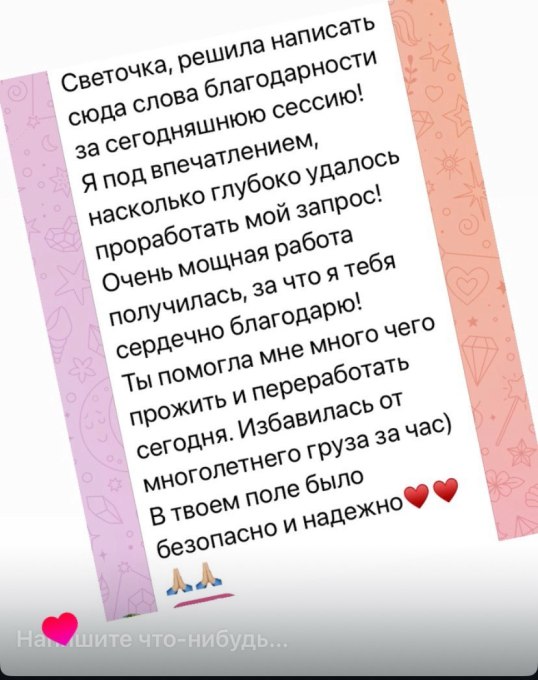 "Я искренне, от всей Души благодарю Светлану Лубянскую за проведенную со мной консультацию. Ее можно назвать - "исцеление детства". Светочка легко и уверенно вела меня, чувствуя , что мне нужно подсветить и исцелить.