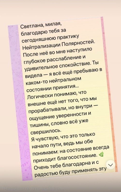 "Я искренне, от всей Души благодарю Светлану Лубянскую за проведенную со мной консультацию. Ее можно назвать - "исцеление детства". Светочка легко и уверенно вела меня, чувствуя , что мне нужно подсветить и исцелить.
